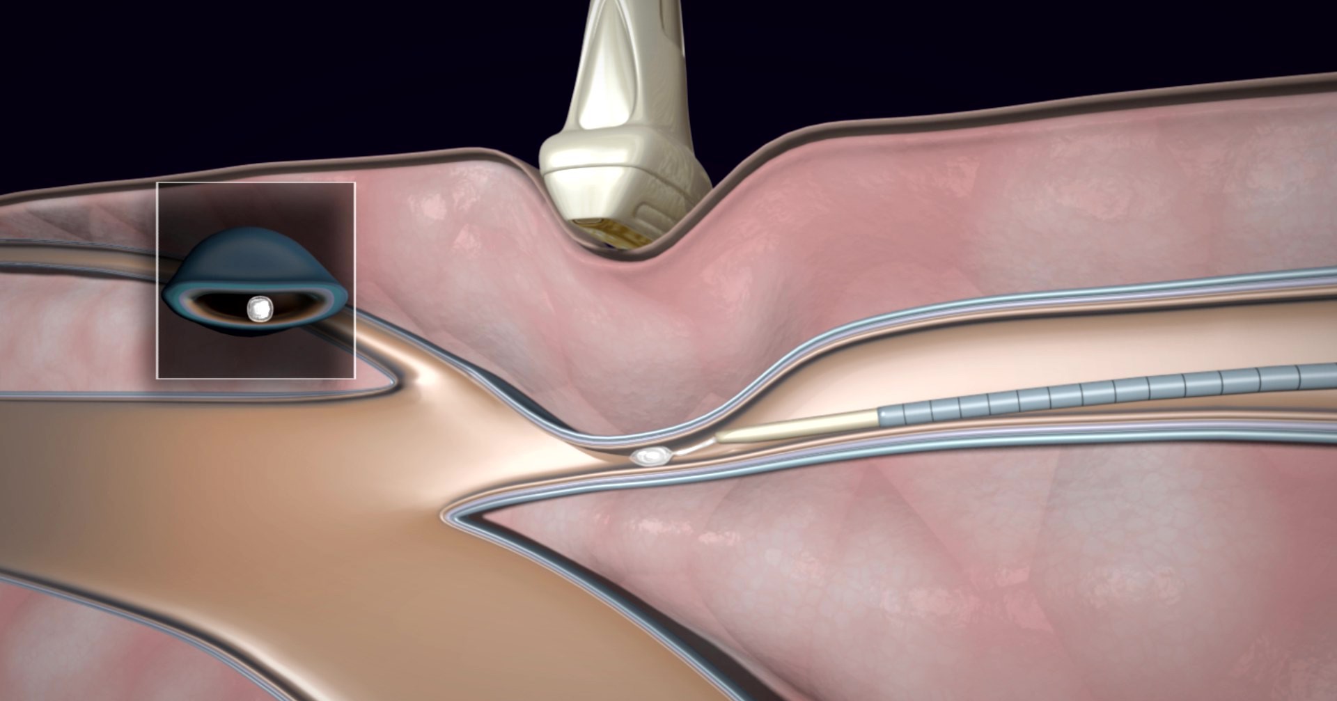 Darstellung des Katheters innerhalb der zu behandelnden Vene. Die Mündung wird mittels der Ultraschallsonde komprimiert.